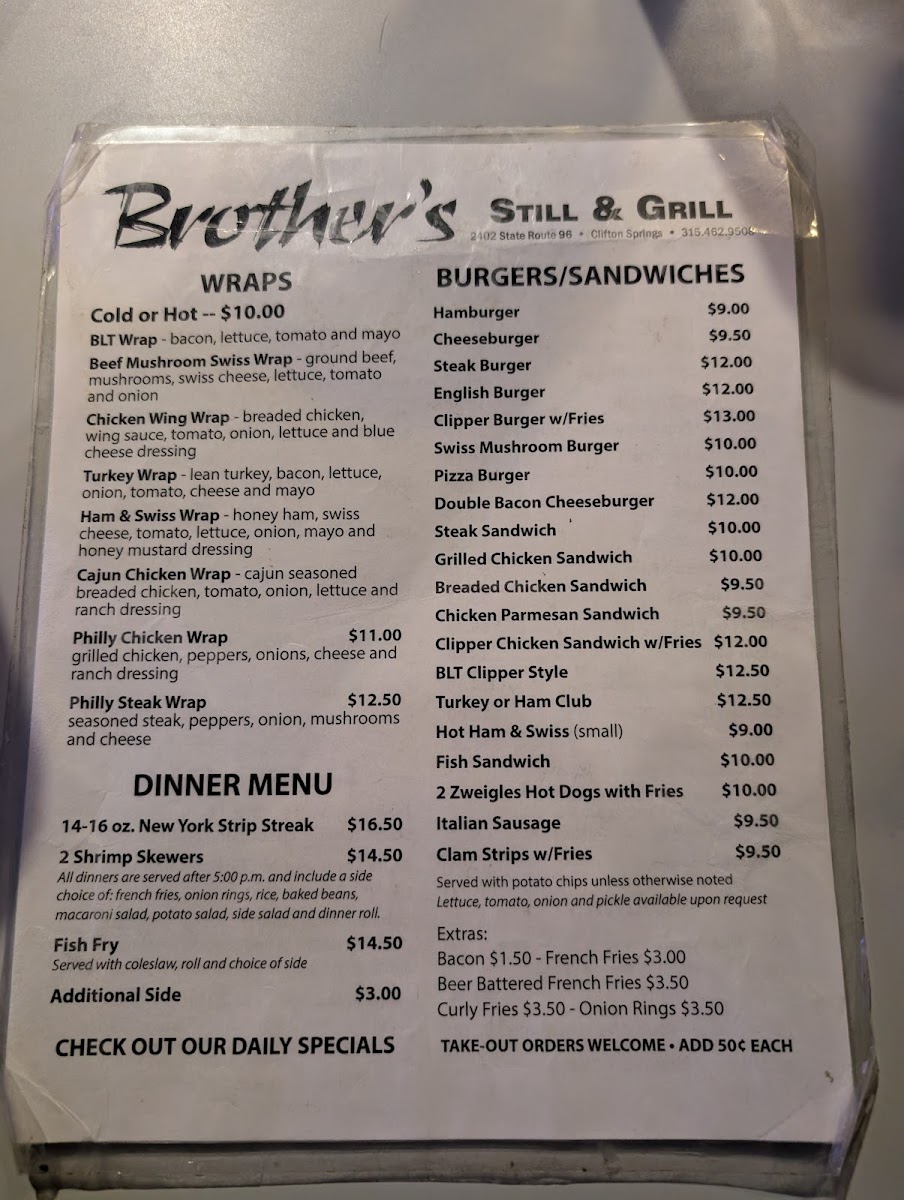 Welcome to Brother's Still & Grill, a hidden gem located in Clifton Springs, NY. This cozy establishment is renowned for its vibrant atmosphere and mouthwatering menu that captures the essence of classic bar fare. Diners rave about their chicken wings, a must-try, praised for being perfectly cooked and slathered in a delicious house hot sauce. The casual vibe is complemented by attentive service from staff like bartender Kady, who ensures a memorable experience for guests.